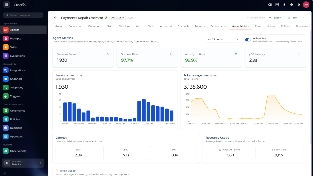 Creatio AI Platform is a unified environment in Creatio for building, deploying, and operating AI Agents. Use it to add AI to your business processes, with clear insight into what each agent does, control over how it behaves, and the ability to adjust it as your needs change.