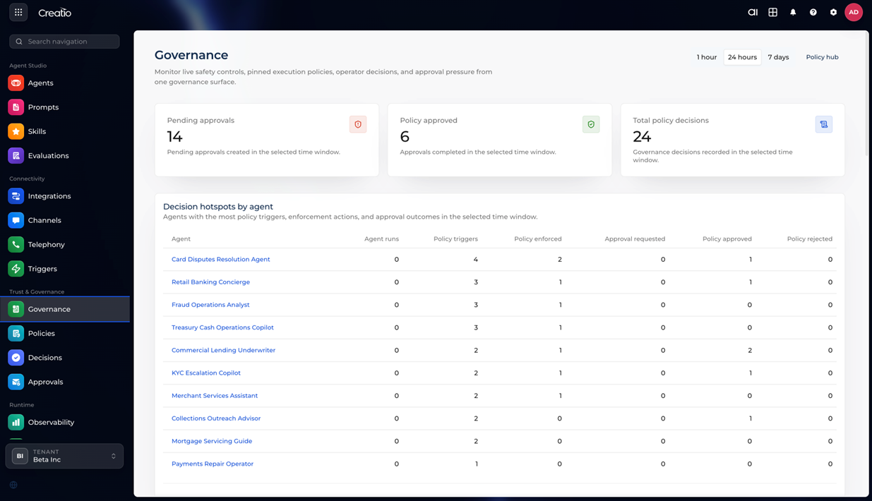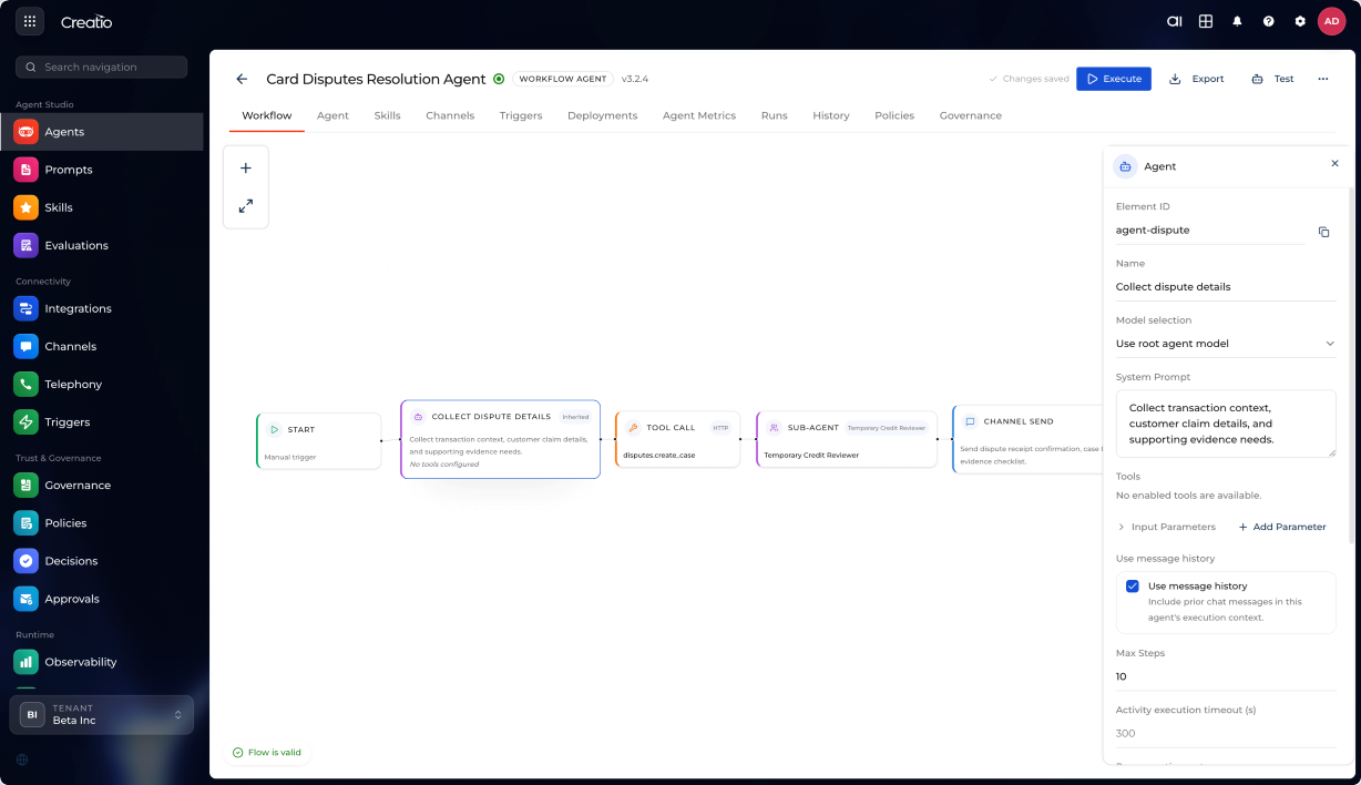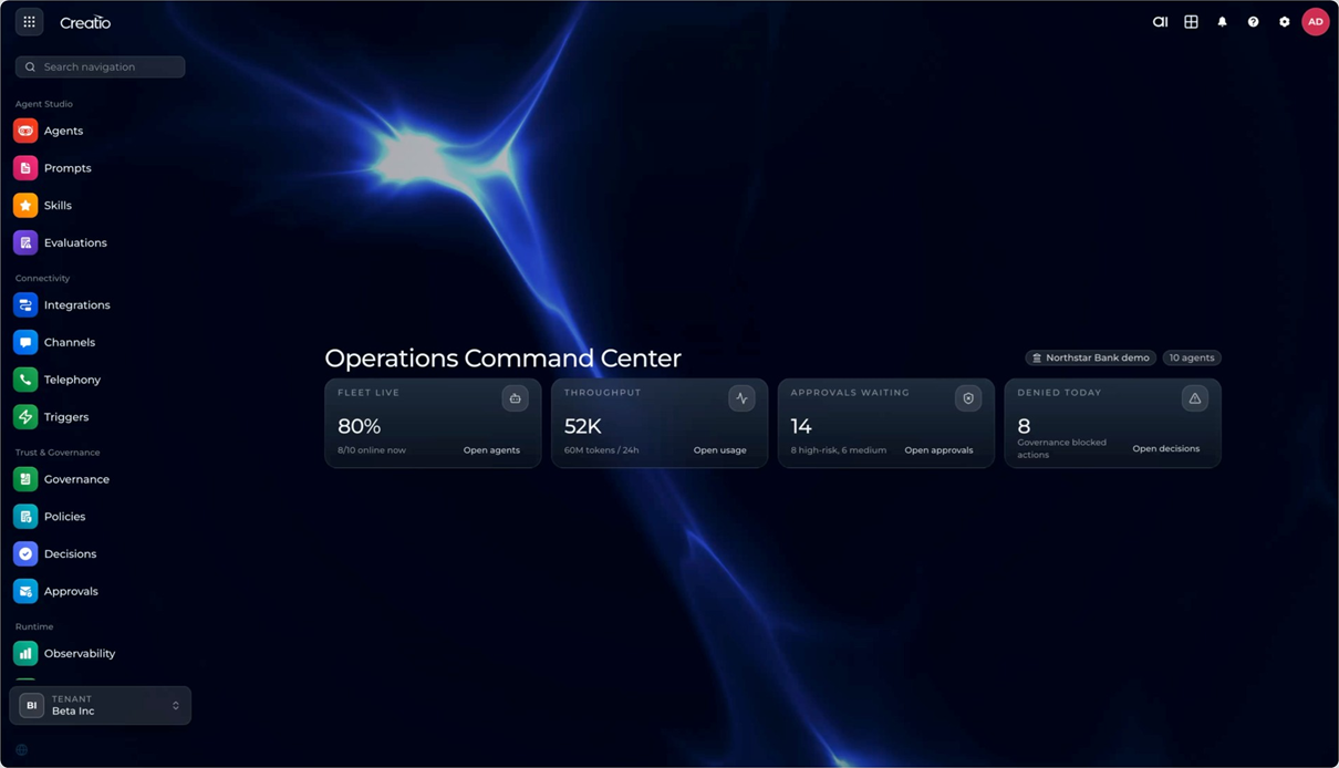 Creatio AI Platform brings together tools for designing, running, connecting, and managing agents. It supports several ways to build agents, from simple natural language setup to structured workflows. Teams with different technical backgrounds can create agents that fit their needs. The platform is LLM-agnostic, supports governance and observability at every stage, and is designed to grow with your organization as AI adoption expands across teams and workflows.