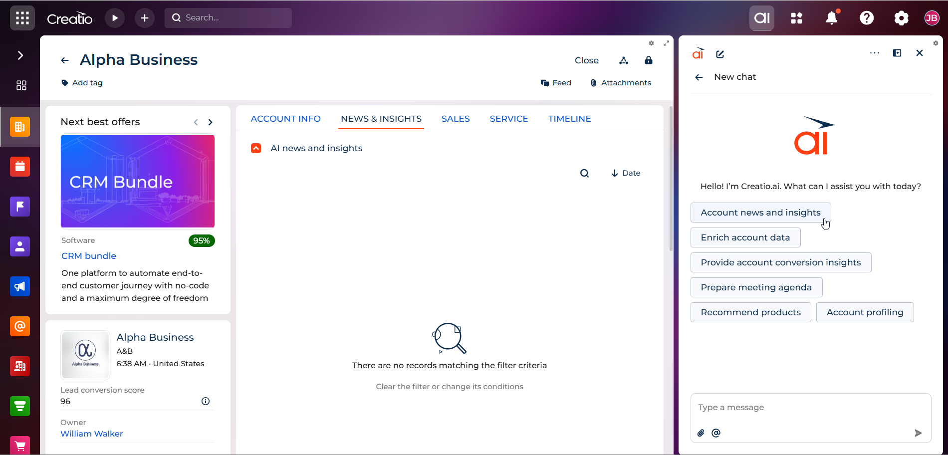 Click the Account news and insights button in the Creatio.ai chat panel. (Fig. 1)