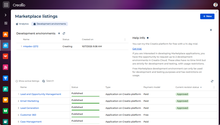 - Cloud: request the Creatio development environment of any base Creatio product using the Creatio Marketplace Console.