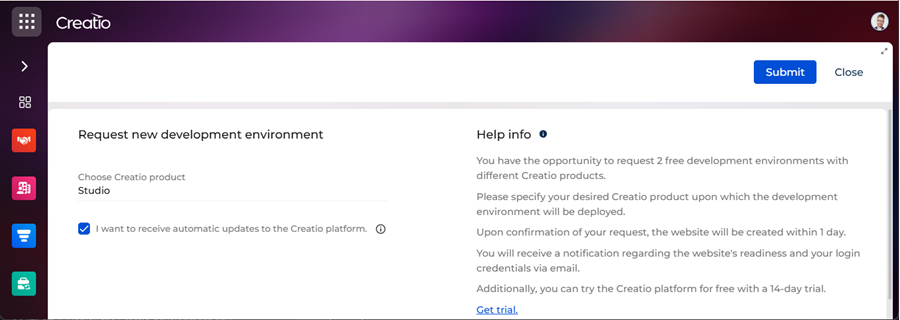 Request the cloud-deployed Creatio development environment