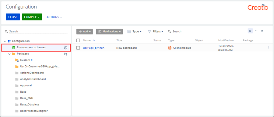 Since version 8.3.1, Creatio displays the environment schemas in the Environment schemas group of the Configuration section.