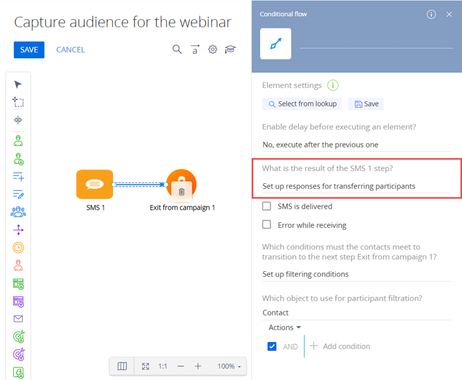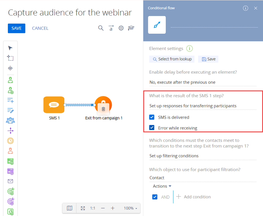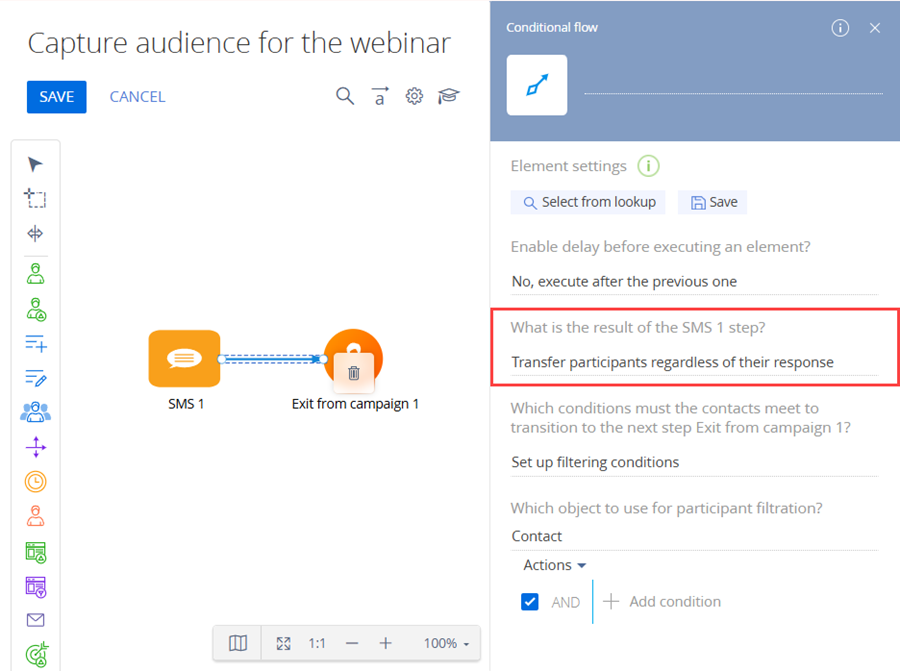 - Add arbitrary elements to the canvas. For example, Exit from campaign.