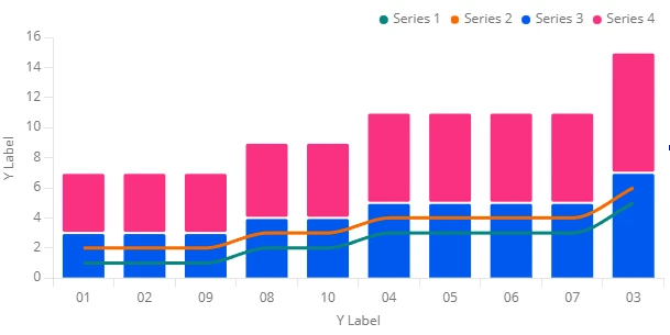 For bars (including stacked bars), lines, and stacked areas with multiple series, apply colors in the recommended order: Blue, Burnt coral, Dark turquoise, Rusty orange, Light blue, Purple. This order maximizes visual distinction between adjacent series (Fig. 4).