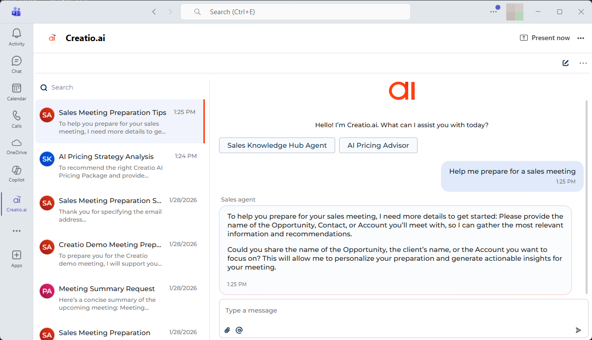 Creatio.ai personal tab in Microsoft Teams. You can now access Creatio.ai anytime directly from Microsoft Teams by using it as a personal tab outside of meetings. After installing Creatio.ai from the Microsoft Marketplace, it appears as a personal app in the Teams app bar, opening the full Creatio.ai chat interface with its own quick skill selection actions, so users can interact with AI directly within their daily Teams workspace without starting or joining a meeting. The personal tab is supported for Creatio websites starting from version 8.3.1, and administrators can configure dedicated quick agent selection buttons for it separately from meeting chat actions using the "teams_outlook_personal" page name.