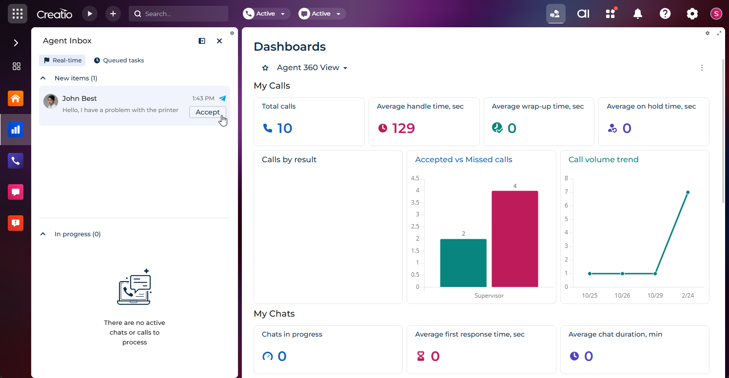 New omnichannel Contact Center app. You can now improve support agent productivity, streamline workload distribution, and deliver consistent omnichannel customer service with the enhanced Contact Center composable app and expanded Agent Inbox capabilities. The solution provides a unified support agent workspace that centralizes real-time and offline interactions, automates routing and prioritization, and enhances chat-based communication with advanced productivity tools. The app is available on Creatio Marketplace.Key enhancements include: