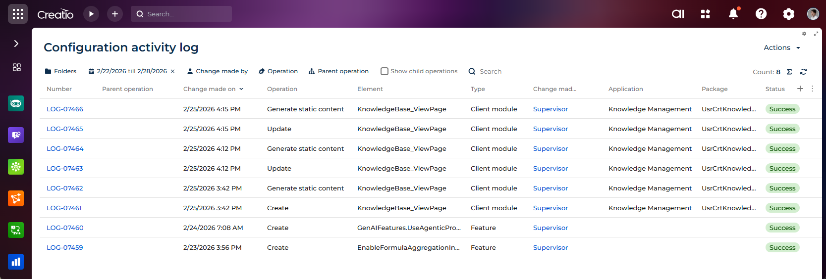 Configuration activity log cleanup. You can now control log storage and maintain up-to-date system records by using a cleaning mechanism for the Configuration activity log. System administrators can perform manual cleanup or configure automatic cleanup based on a defined retention period. The process also removes all files attached to Configuration activity log records and related compilation history records.