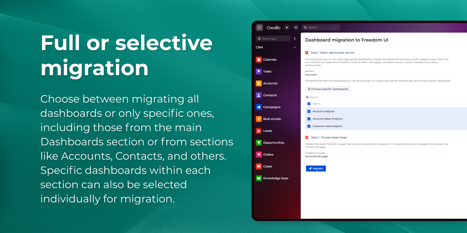 Dashboard migration to Freedom UI. You can now simplify the transition from Classic UI to Freedom UI by migrating dashboards using a dedicated Dashboards migrator Marketplace application. The app provides a manual migration mechanism via a Migrate button and supports dashboards from the Dashboards section as well as dashboards embedded in other sections, such as Accounts and Contacts. Learn more: Dashboards migrator (Creatio Marketplace).
