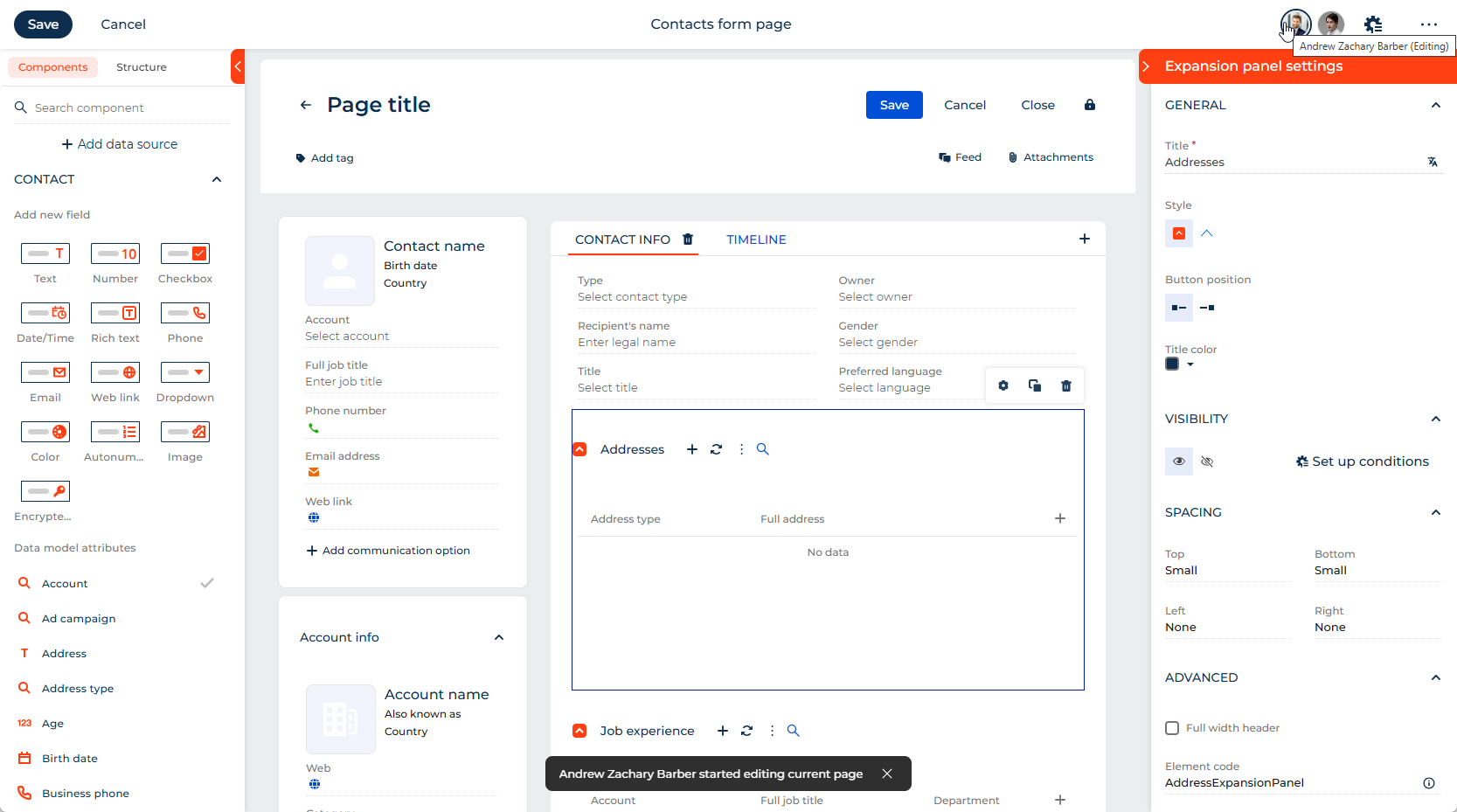 Enhanced user presence and editing awareness. You can now better coordinate collaborative work by seeing not only who has opened a page in Freedom UI Designer and Freedom UI Mobile Designer but also who is actively editing it. Creatio displays a notification when another user starts editing a page and uses animated avatars to visually indicate editing activity. The user presence element adapts to different screen sizes and automatically collapses when multiple users open the same page, with the option to view the full list of users in a mini page.