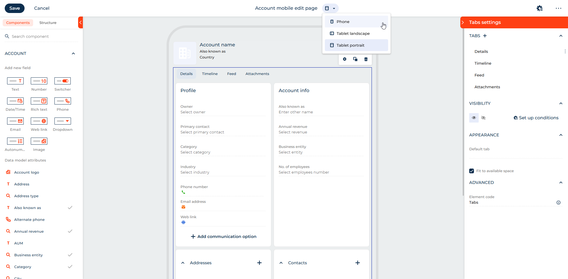 Multi-device canvas presets and view switcher. You can now design and validate responsive page layouts more efficiently in the Freedom UI Mobile Designer by switching between predefined layouts for phone, tablet portrait, and tablet landscape views. A convenient view switch control near the page title lets you instantly toggle between device modes, automatically updating canvas proportions, styling, and configuration without reloading the page. This enhancement improves layout accuracy and consistency across devices, reduces validation time and rework, and makes multi-device no-code UI design more predictable and efficient.