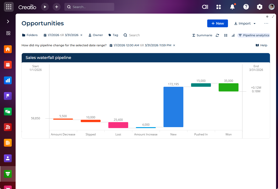 Waterfall pipeline analytics. You can now analyze and visualize pipeline changes in the Lead and opportunity management app using the new Sales waterfall pipeline widget that clearly breaks down how deals impact pipeline movement over time. The widget shows contributions from new opportunities, amount updates, close date shifts, and closed outcomes, helping teams understand and explain forecast changes without manual reconciliation or spreadsheets. You can specify the widget data sources and define key column mappings during setup. Based on the page context, Creatio dynamically generates filter collections and automatically persists them in the filters array of the widget view configuration within the page schema. To take advantage of this functionality, add and turn on the EnablePipelineAnalytics feature and turn on the ShowDesignerDemoItems feature. Learn more: Manage an existing additional feature, Implement a custom additional feature.