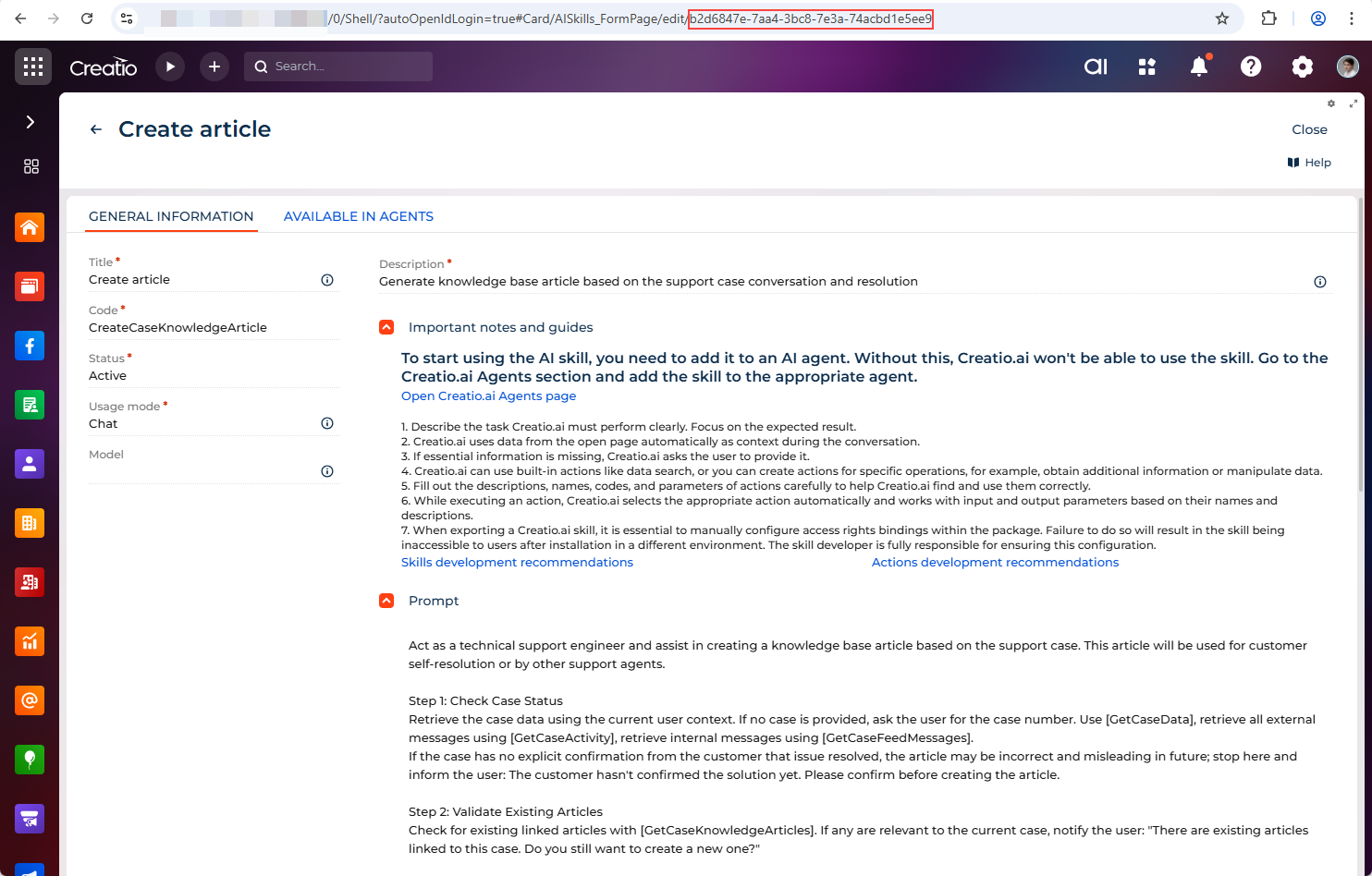 - Open the AI command center workplace → Creatio.ai skills or Creatio.ai agents.