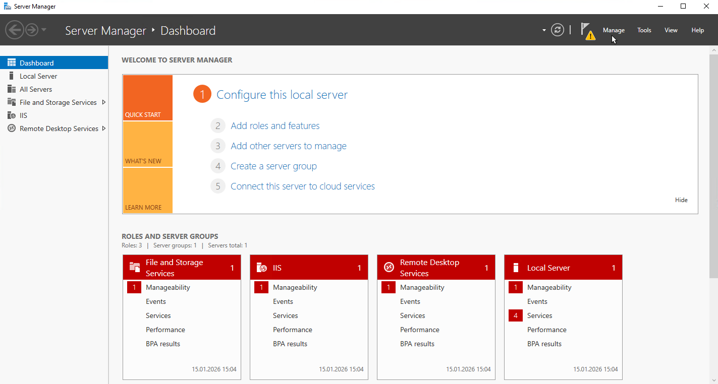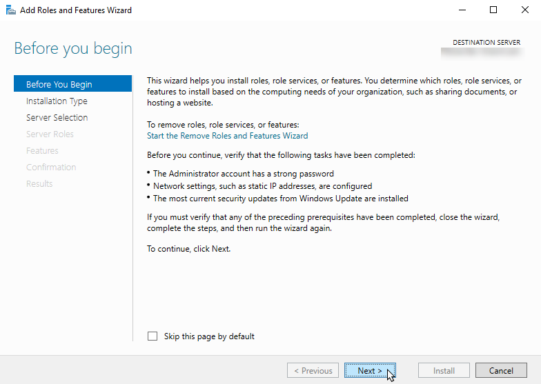 Click Manage → Add Roles and Features. This opens Add Roles and Features Wizard.